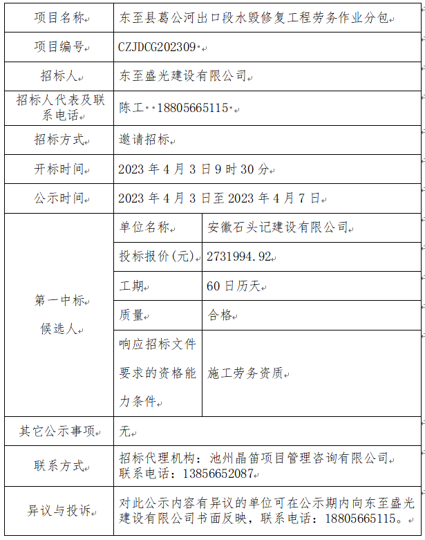東至縣葛公河出口段水毀修復(fù)工程勞務(wù)作業(yè)分包中標(biāo)候選人公示