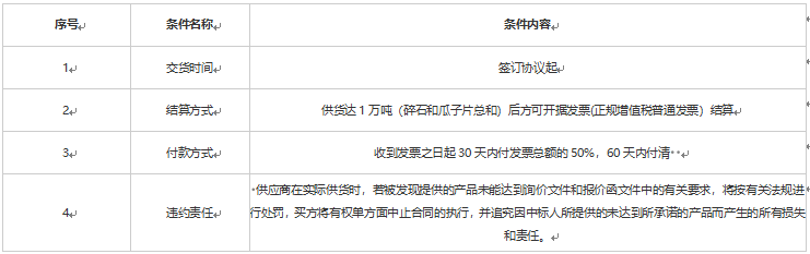 (四)標(biāo)段內(nèi)容:混凝土生產(chǎn)原料碎石(礦山石子及瓜子片,以下簡(jiǎn)稱碎石)。 以上原料供應(yīng)量為2萬噸(碎石總和)單日需求量以本公司計(jì)劃為準(zhǔn)。